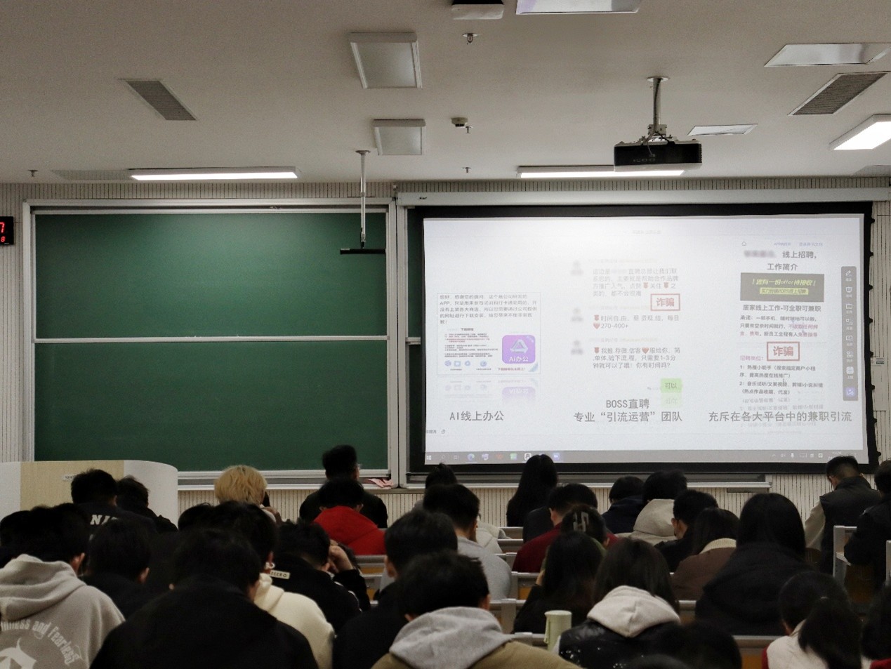 讲座伊始,陈延龙警官以《莫让诈骗斩断飞翔的翅膀》为题,围绕“什么是电信诈骗”“电信诈骗的主要目标”“电信诈骗的行为特点”“电信诈骗为什么容易成功”四方面,结合真实案例进行了深入浅出的讲解。他剖析了常见的诈骗套路,解读了电诈的目前趋势,夯实了同学们的理论认知。随后,孔涛警官以《破“知”而后立,打赢大学校园反电诈的“认知战”》为题,结合校园真实案例,详细讲解了甄别电诈的实操技巧。他强调,全体同学应时刻保持警惕,增强辨别能力,做到“不轻信、不转账、不泄露”。