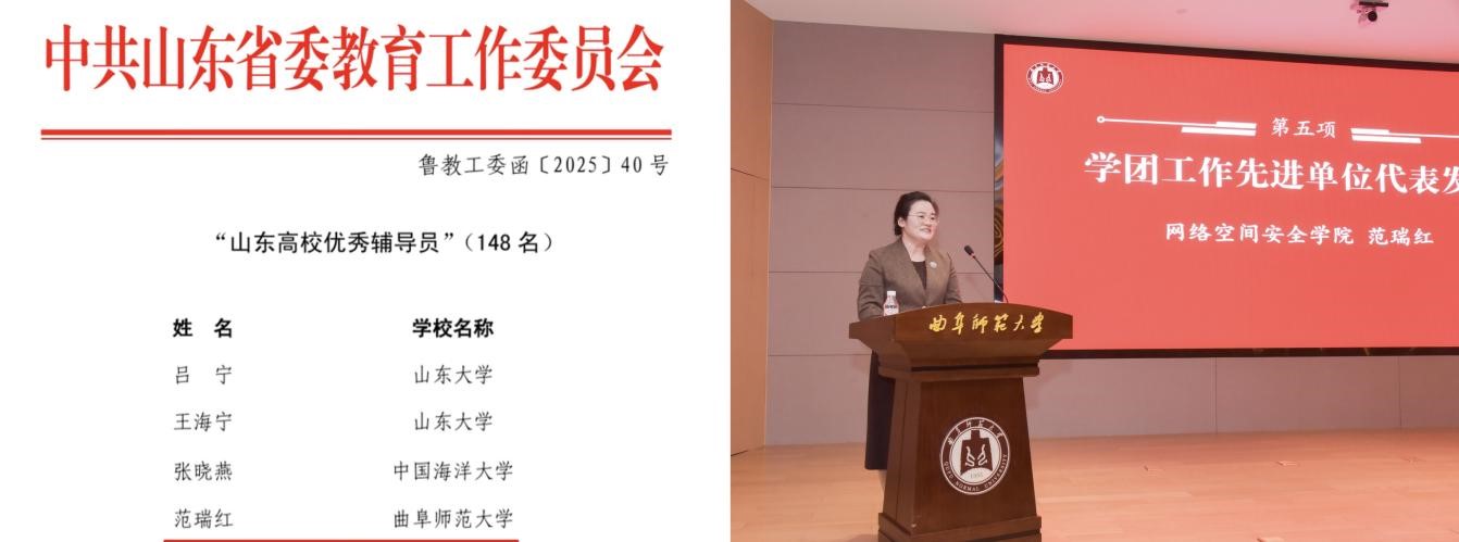 荣获“山东高校优秀辅导员”(左图)、作为学团工作先进单位代表发言(右图)