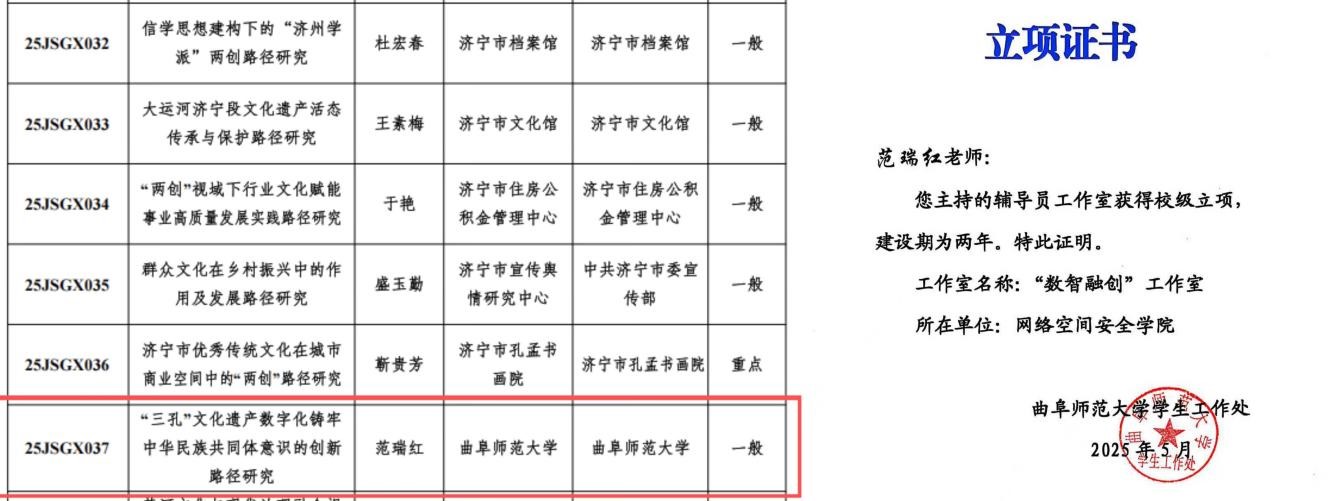 济宁市社科规划项目成功立项(左图)、“数智融创”辅导员工作室获校级立项(右图)