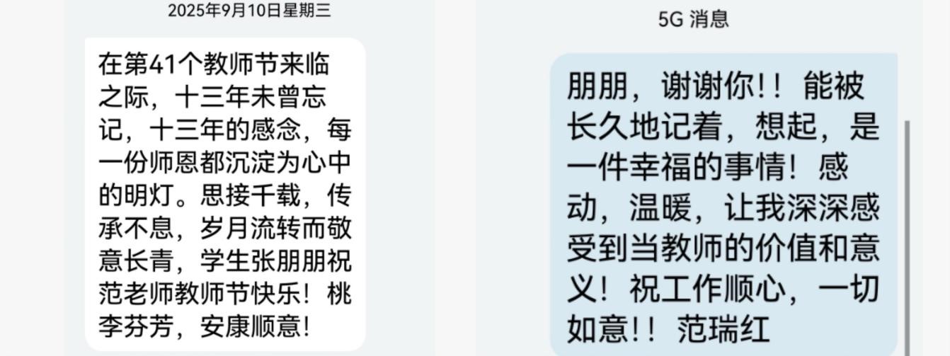 我没有直接回答,而是和他分享了一条学生发来的节日祝福短信。短信中写道:“在第41个教师节来临之际,十三年未曾忘记,十三年的感念,每一份师恩都沉淀为心中的明灯。思接千载,传承不息,岁月流转而敬意长青。学生张朋朋祝范老师教师节快乐!桃李芬芳,安康顺意。”