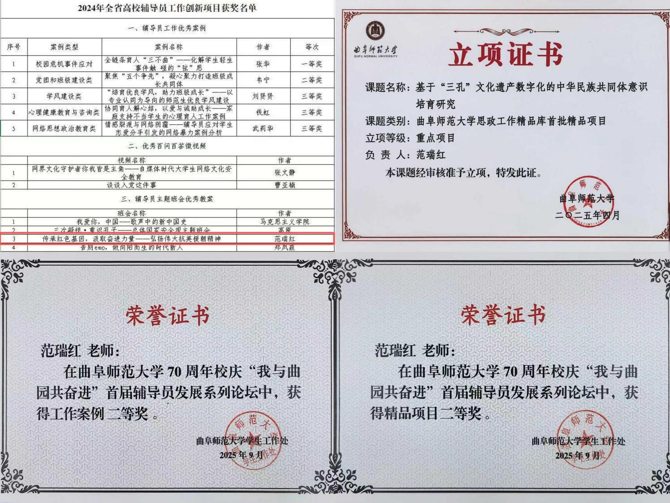 数字人文的探索深度融入日常思政工作,让育人实践更具人文情怀,也为思政教育注入了活力,结出了扎实的育人硕果。2025年4月,我申报的主题班会教案《传承红色基因,汲取奋进力量》,获评山东省高校辅导员工作创新项目优秀教案;主持的《数字赋能传文脉・文化铸魂育同心》项目,入选学校2025年思想政治工作首批精品项目;在“我与校庆共奋进”首届辅导员发展论坛中,亦收获工作案例二等奖、精品项目二等奖各1项。