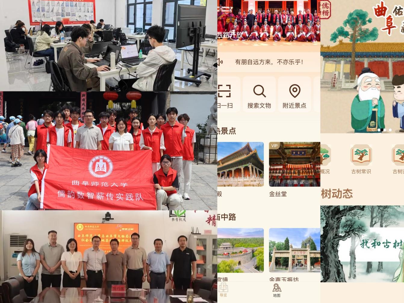 的数字技术优势,指导学生用无人机航拍,采集孔庙中轴线建筑的纹路,捕捉千年古树的风骨,记录满汉合璧碑刻的意蕴,构建起兼具技术精度与文化深度的数字档案库。为推进数字化成果向思政场景转化,我与专业老师携手指导学生科创团队,研发出“夫子智旅”“儒楷新韵・曲阜古树”两款小程序,让传统文化以轻量化、互动化的形式触达更多人。组建“儒韵数智薪传”社会实践队与“文物变形记”志愿服务队,联合曲阜市文物局建立大学生社会实践基地,让学生在服务社会中传递文化温度。实现了文化遗产从静态保护到动态传承、从学术研究到社会服务、从文化传播到思政育人的多维突破,也为文化遗产数字化与高校思政教育融合,打造出可复制、可持续的“三孔样本”。