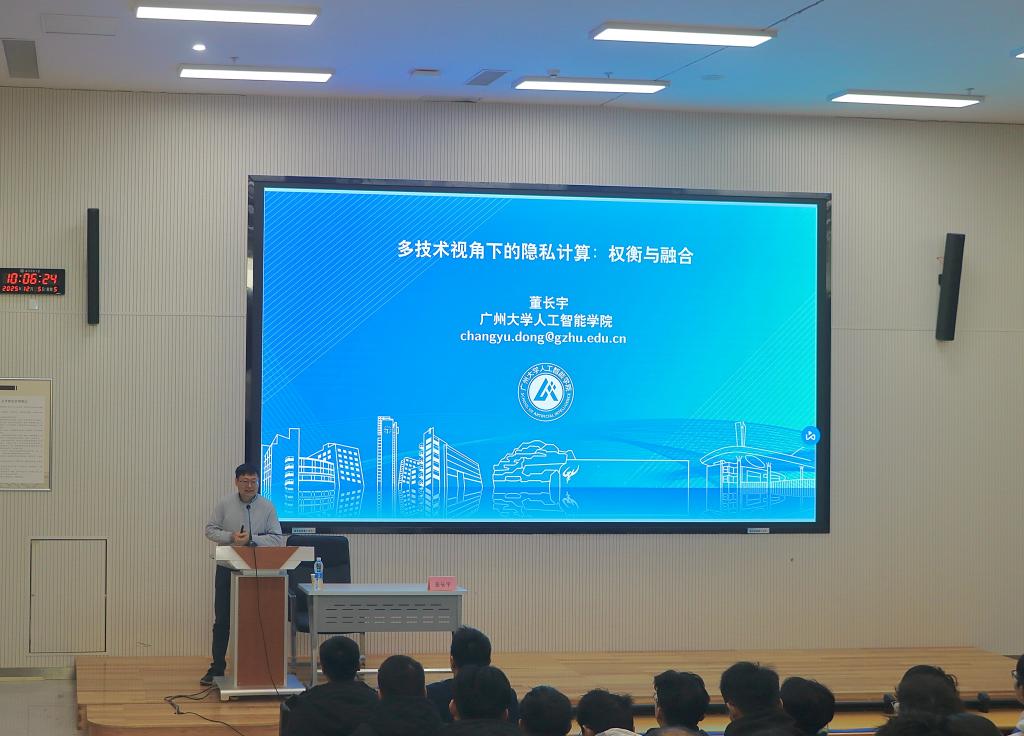 作题为《多技术视角下的隐私计算:权衡与融合》的学术报告。本次报告在致知楼B202举行,由马旭副院长主持,教师代表、2024以及2025级全体研究生参加。