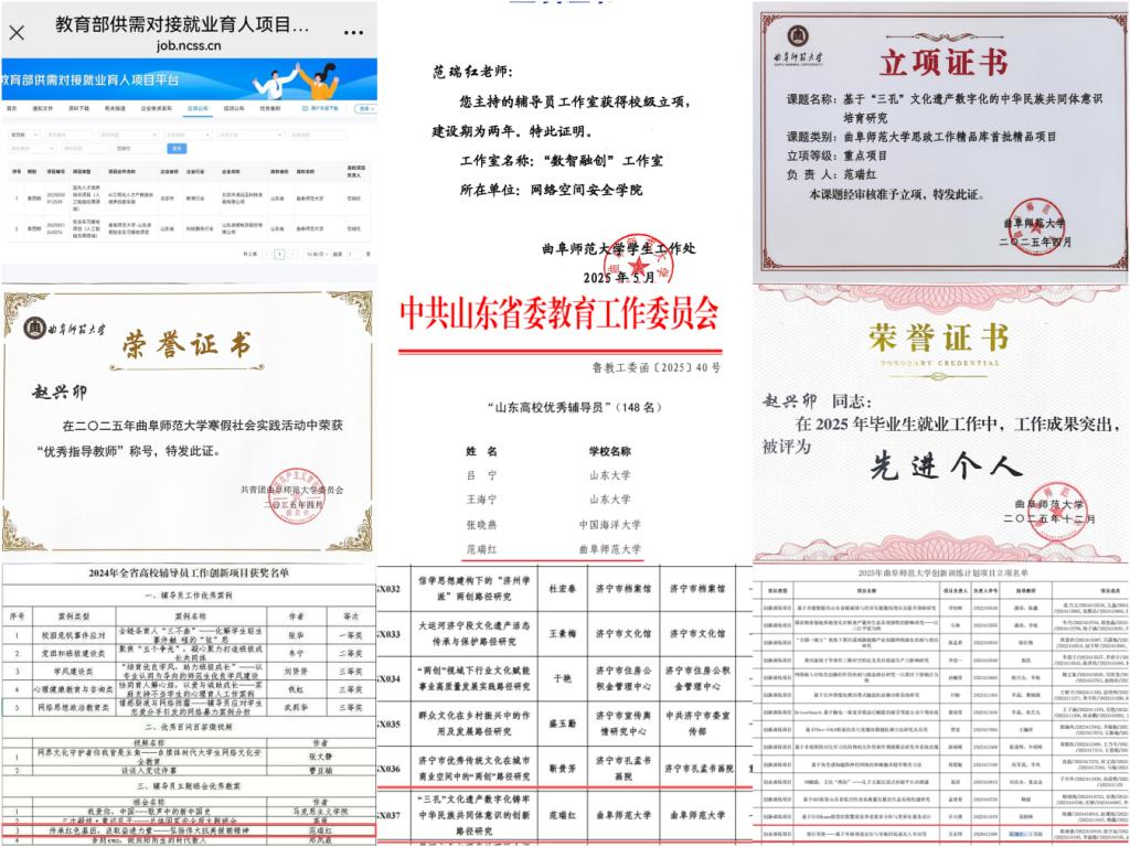 这支队伍各怀绝技、各有专攻,在育人领域绽放光彩:范瑞红主持2项教育部供需对接就业育人项目,并依托校级“数智融创”辅导员工作室,将就业指导深度嵌入人才培养全过程,获评学校就业工作优秀成果奖;主持1项济宁市社会科学规划研究项目、主持1项bet365 高校思想政治工作首批精品项目;获评山东高校“十佳百优辅导员”称号、1项山东省高校辅导员工作创新项目辅导员主题班会优秀教案。于媚媛被评选为“我最喜爱的曲园好教师”、军训工作“优秀指导员”。洪亚玲撰写的工作案例荣获全国高等师范院校学工部长工作年会成果一等奖;相青在诚信教育主题班会展示活动中荣获教案一等奖和视频一等奖。武玉龙获山东计算机党建与科技创新优秀成果奖二等奖。张晗获得辅导员素质能力大赛三等奖。在全校“我与曲园共奋进”辅导员论坛中,团队更是斩获一等奖4项,二等奖3项,三等奖3项,实现全员参与并获奖。3名辅导员在就业工作中获评先进个人。荣誉背后,是深夜办公室的灯光,是考研前夕的每一句鼓励,是就业季“永不掉线”的答疑解惑。他们以扎实的专业能力为学生成长赋能,以无微不至的温情守护学生心灵,构成了一个目标同向、协同高效、充满归属感的育人共同体。