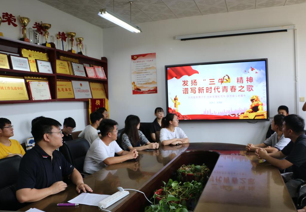 会议室围绕“三牛”精神,为本科生党员上了一堂生动的主题党课:《发扬“三牛”精神,谱写新时代青春之歌》