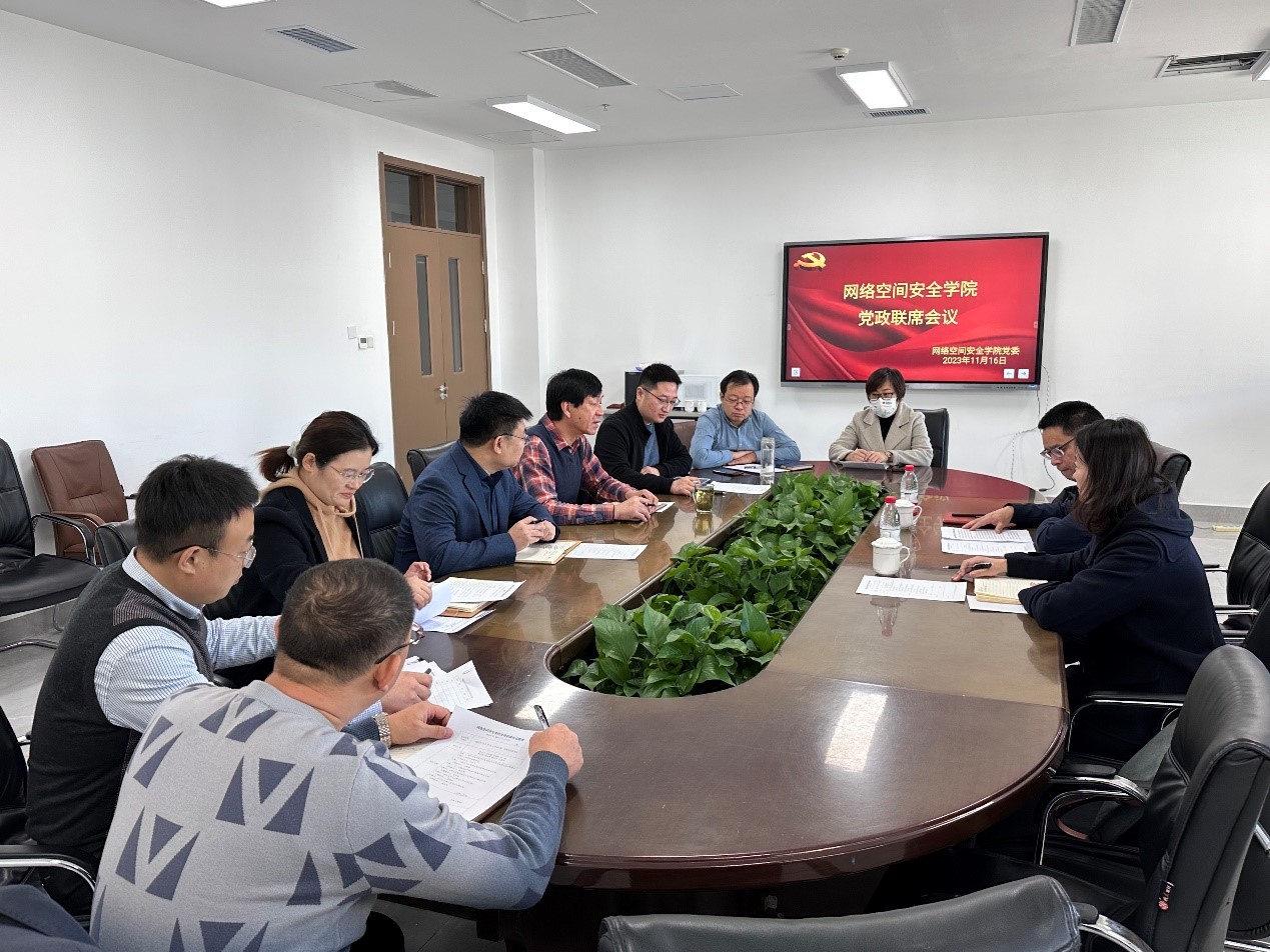 会上,大家汇报了与济宁市公安局共建网络安全取证实验室、与山东融发公司共建产教融合基地、本科生赴南京紫金山实验室见习事宜、2024届就业工作启动及方案、学生科技创新比赛启动、办公区走廊文化设计方案等议题并讨论通过。