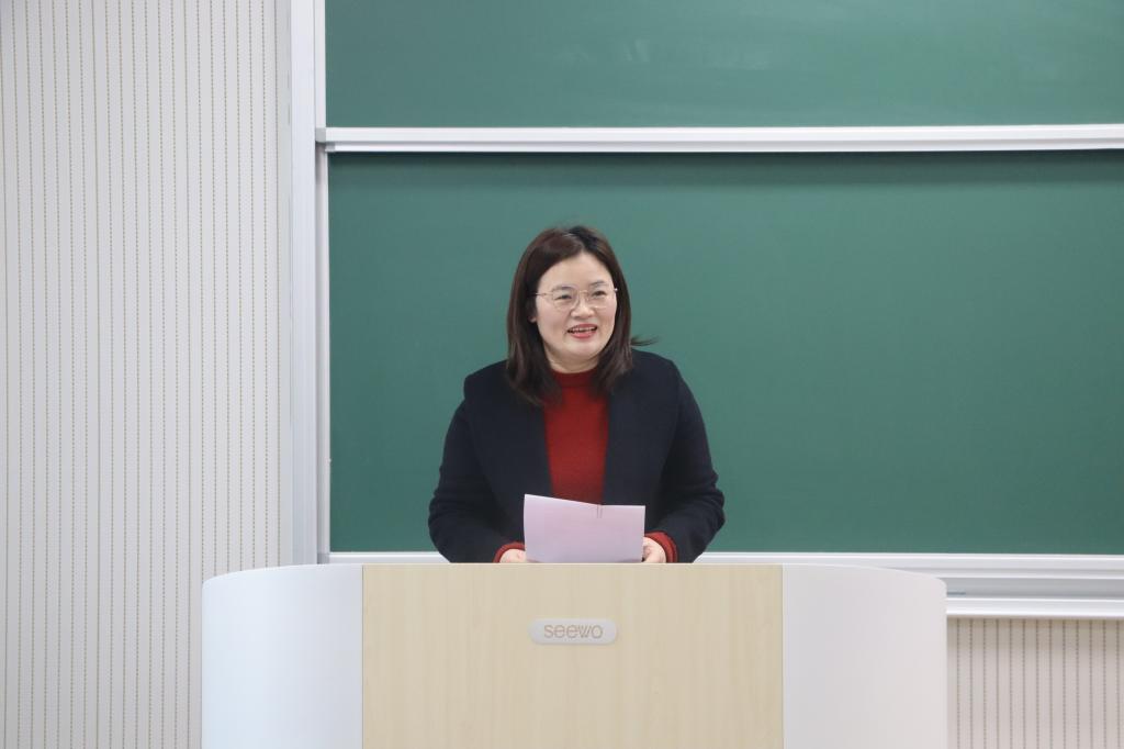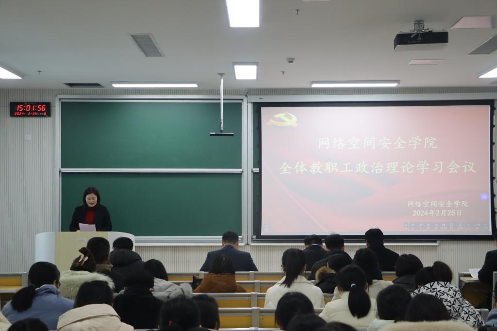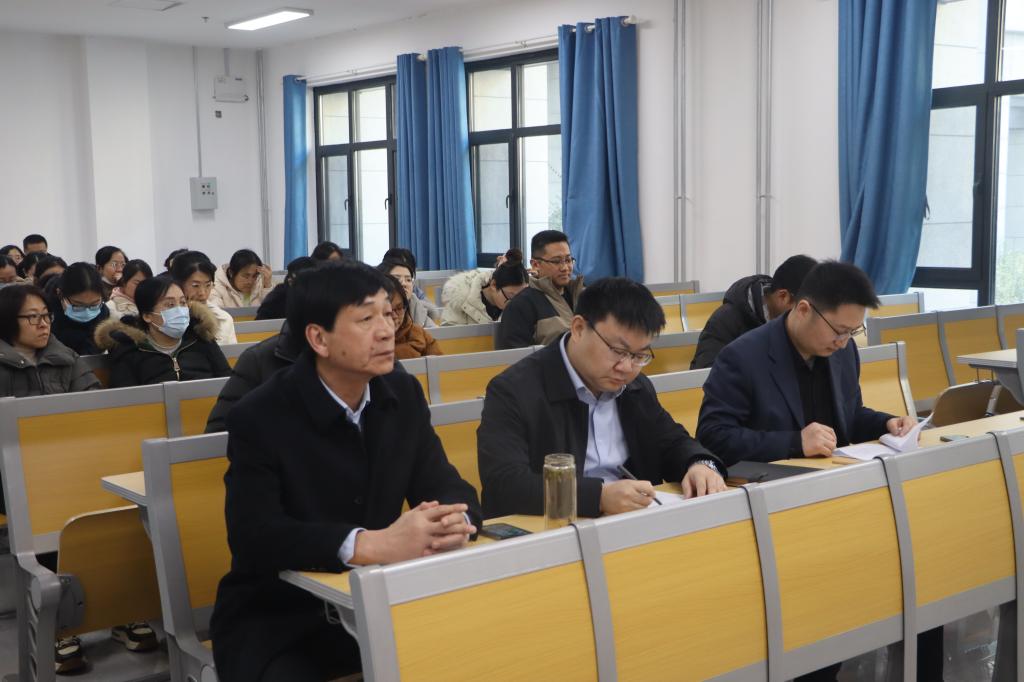 于格物楼B107教室召开全体教职工政治理论学习会议。党委书记田云飞、院长王茂励、副书记范瑞红、副院长马旭及全体教职工参加会议。范瑞红担任主讲。