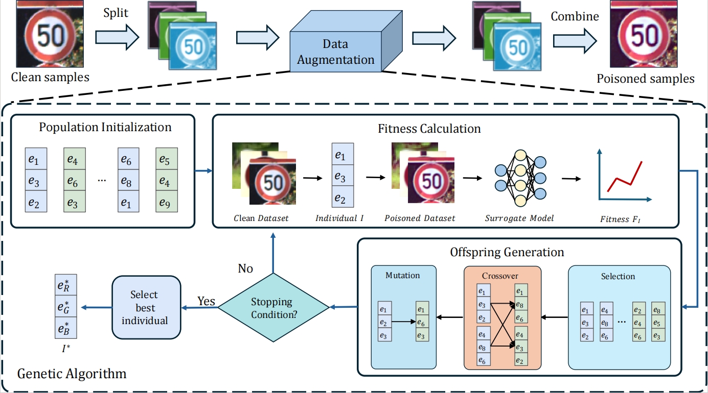 深度神经网络(DNN)在众多领域的应用中越来越流行,最新的研究表明,DNN容易受到后门攻击的威胁。后门攻击方案往往涉及高昂的计算成本,使其在现实场景中难以应用。数据增强是一种常用的技术,通常用于提高模型的泛化能力。由于数据增强的计算开销低,且生成的有毒图像不易引起受害者的怀疑,因此可以作为生成触发器的理想来源。当前基于数据增强的后门攻击策略通常随机选择增强技术组合,这种方案往往难以实现最优的攻击效果。为了解决这一问题,本文提出了一种名为 BGD3A 的新型后门攻击方案。该方案由遗传算法驱动,旨在优化数据增强组合的选择方案。通过自定义适应度函数,攻击者可以生成满足其目标的最优增强技术组合。大量实验结果表明,BGD3A 不仅能实现非常高的攻击成功率,还能在面对当前最先进的后门防御机制时表现出较强的鲁棒性。