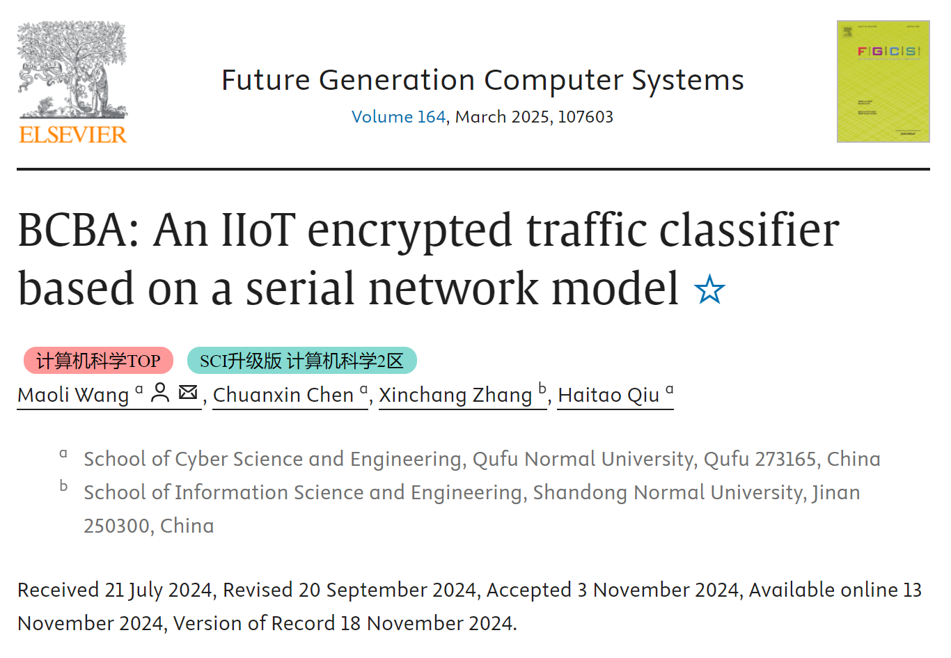 为第一完成单位,王茂励教授为论文第一作者和通讯作者,2022级研究生陈传鑫为论文第二作者(学生第一作者)。Future Generation Computer Systems是中国计算机学会推荐期刊,是中科院二区TOP及JCR一区期刊,最新影响因子6.2。