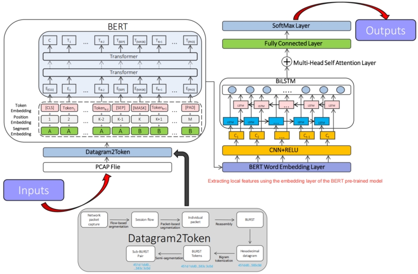 随着工业物联网 (IIoT) 的快速发展,确保网络流量的安全性和隐私性变得尤为重要。对加密流量进行分类和识别是增强网络安全的关键步骤,但传统的流量分类方法通常难以处理 IIoT 环境的复杂性。在本文中,我们提出了 BCBA 模型,这是一种基于 transformers (BERT) 的双向编码器表示串行网络模型,它显著提高了加密流量分类性能,并且可以比原始 BERT 分类器快四倍以上进行训练。BCBA 方法从预训练 BERT 模型的嵌入层获取词向量表示,使用卷积神经网络 (CNN) 提取局部特征,采用双向长短期记忆 (BiLSTM) 网络来捕获交通数据中的时间依赖关系,并利用多头自注意力机制来提高全局依赖关系理解。这项研究证明了深度学习在增强 IIoT 安全性方面的有效性。它还为未来的研究提供了新的视角和技术路线,特别是在加密流量处理和分类应用方面。