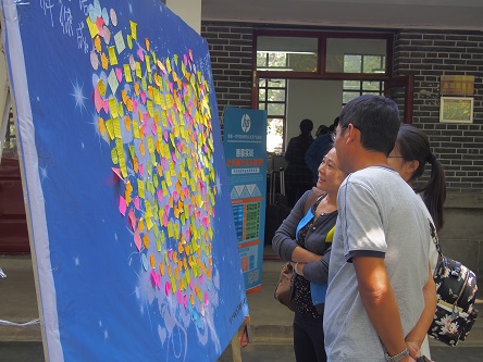 的工作使新生能更快适应大学新的学习和生活。在新生办理完入学手续后,陆续走到了我们树立的爱心寄语展板。当看到展板上父母对他们的祝福和期望时,泪水不禁涌上眼眶,和父母深情的拥抱在一起。面对即将开始的大学生活,他们正满怀对着未来的憧憬,带着父母的爱和期待开始自己独立自主的新生活。