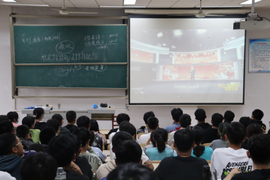 在实验中心A401、A413组织观看“同上一堂奥运思政大课”,辅导员于媚媛和21级全体学生共同观看视频。