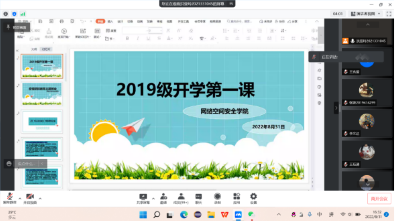 新学期“开学第一课”主题班会的顺利召开,增强了学生们的安全防范意识,激发了同学们学习的积极性与主动性,提升了学业规划的意识和能力,为新学期学习生活的顺利开展打下了良好的基础。相信网安学子将在新学期取得新突破,再上新台阶。