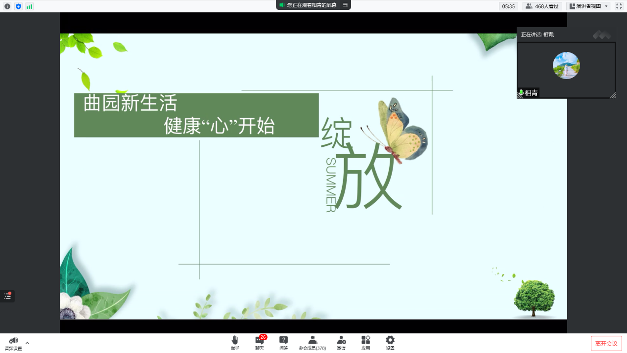 召开了主题为“曲园新生活,大学心适应”的心理健康线上教育。本次线上教育由辅导员相青担任主讲人,学生会主席季轩正,22级全体新生参加了此次活动。