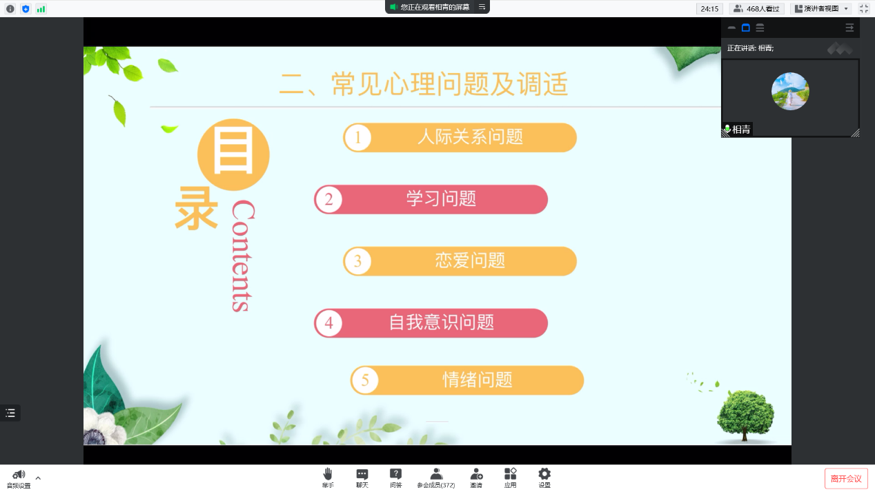 会议伊始,相青就大学生活中容易遇到哪些心理上的问题与22级新生展开热烈的讨论,了解了学生心理压力及困惑。随后相青从人际关系、学习、恋爱、自我意识、个人情绪等学生心理问题展开详解,鼓励学生加强交流沟通,以积极乐观的心态对待生活。会末,相青对会议内容进行了总结,并与新生进行了友好的互动交流,线上教育在一片欢乐的氛围中结束。
