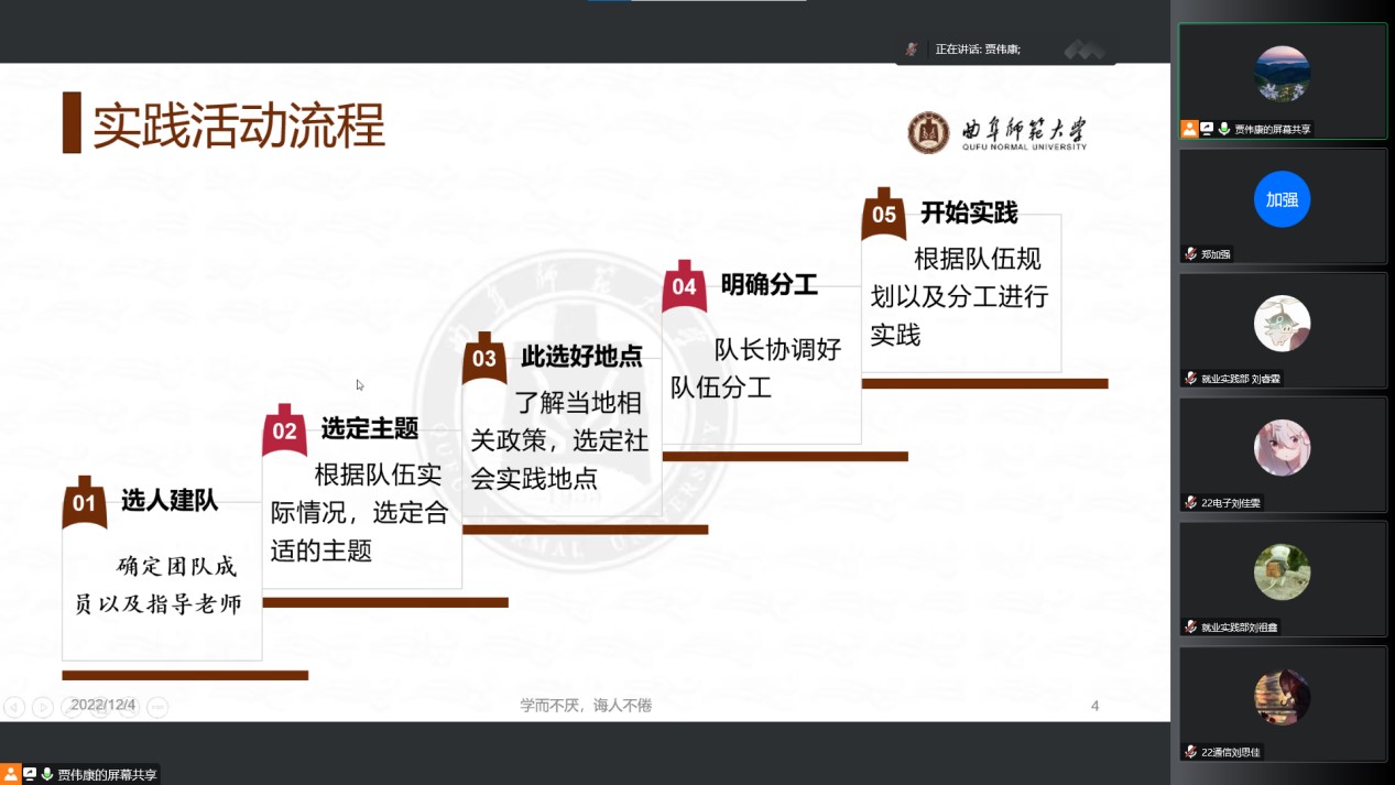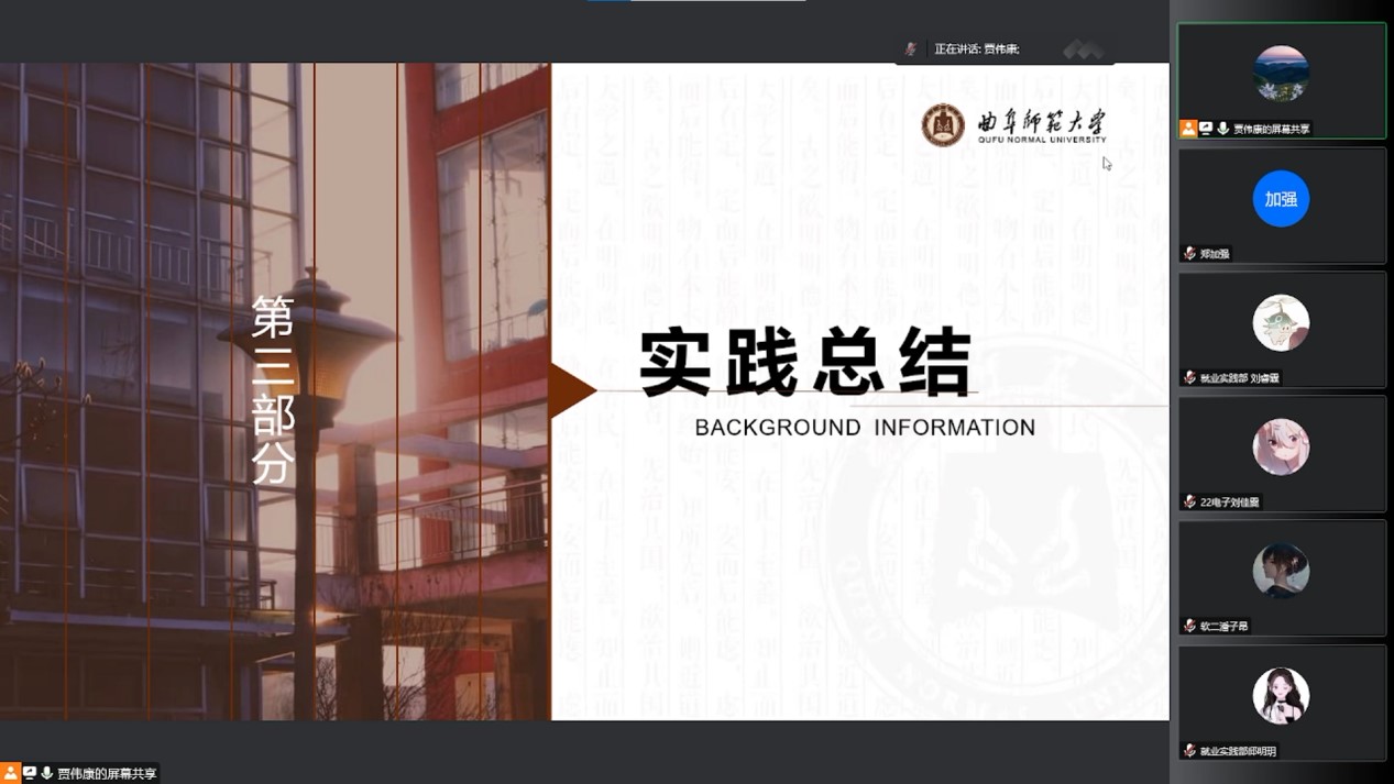 本次宣讲会从实践报名、实践过程、实践总结和实践答辩四个方面进行了宣讲。会议伊始,贾伟康结合相关实例向同学们讲解了相关的实践活动流程,对实践主题、“青鸟计划”及报名流程进行了详细的阐述,并对“青鸟计划”的意义进行了着重强调。“青鸟计划”是连接学生与工作实习单位之间的纽带,帮助学生在求职过程中保障自身权益,进一步锻炼同学们各方面能力,让同学们了解到实习过程中的相关内容,从而进一步引导同学们开展职业规划、确定自己的就业方向。随后,陈卓然从答辩PPT、答辩表现及实践总结三个方面进行了宣讲。最后,贾伟康对同学们存在的疑惑进行了详细地解答,并鼓励同学们积极参加此次的寒假社会实践。