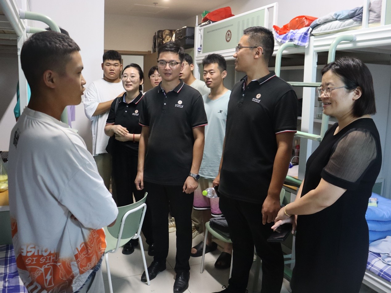 党委副书记范瑞红、团委书记丁允念、辅导员武玉龙、于媚媛走访新生宿舍,认真听取学生需求,切实解决问题,并向新生们开启人生新旅程表示祝贺,鼓励新生用心感受曲园氛围,科学规划大学生活,为全面成长成才打下坚实基础。