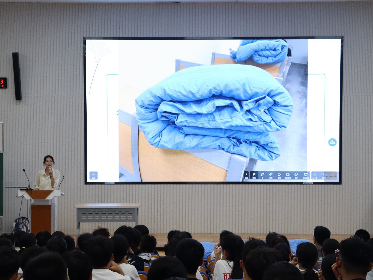 活动伊始,陈士洁详细讲解了宿舍卫生的检查标准,特别提醒与会学生要着重注意柜子未关闭、门口堆放杂物、地面头发水渍等在检查过程中常出现的问题。随后,宿卫部针对违规电器、军训内务、宿舍晚归等问题详细解读,帮助新生迅速熟悉宿舍检查标准和安全知识,营造安全舒适的校园生活。活动最后,陈士洁为新生讲解了将被子叠成“豆腐块”的正确方法,包括如何选择被子、如何平整地铺放、如何调整被子的细节等,并邀请新生上台展示学习成果。