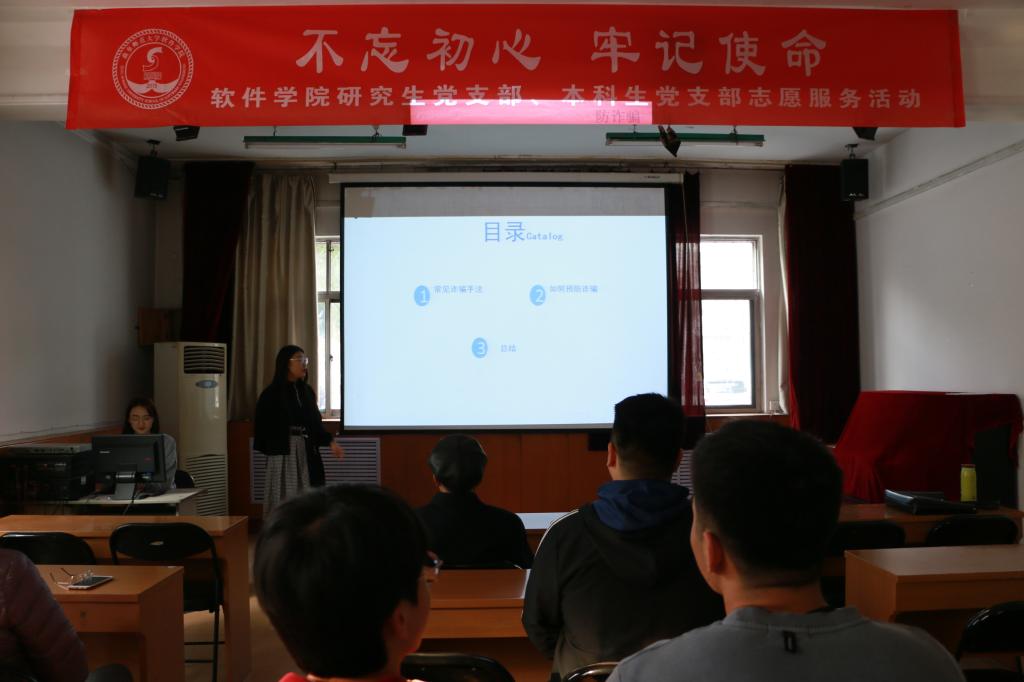 研究生党支部和本科生党支部在老干部楼放映厅顺利开展了“不忘初心、牢记使命”主题教育之防诈骗讲座。