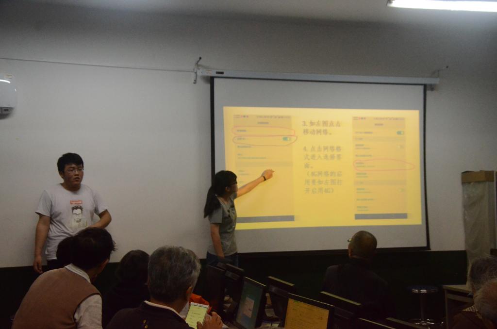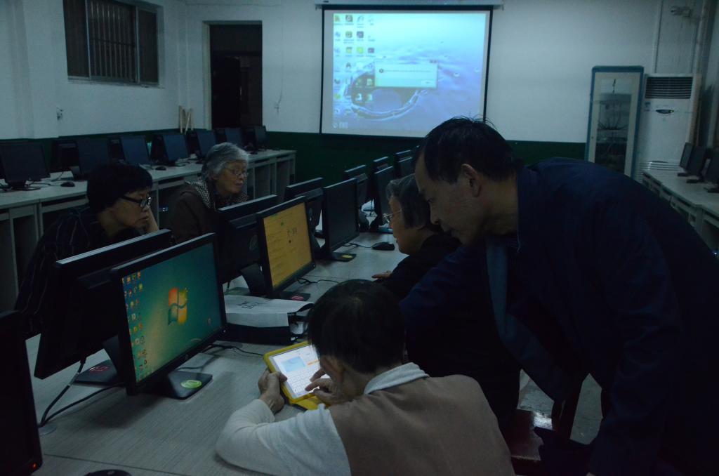 齐邦强在培训时强调了培训事项,要求讲授人员要细致耐心,以一对一教育为主,放慢速度让老人们真正学到知识。社会实践部孙鑫栋、郭慧琳同学通过PPT投影的方式为老人们详细讲解了如何通过机房电脑连接网络,如何通过手机微信、QQ等聊天工具与家人朋友进行文字、语音和视频聊天等。老人们学习热情高涨,积极询问智能电子产品的相关使用问题,同学们耐心仔细地为老人们做了解答。