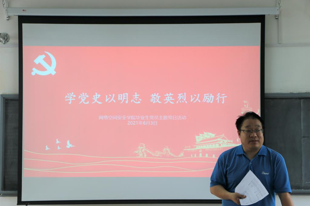 本科生党支部在体育教学部228教室举行以“学党史以明志,敬英烈以励行”为主题的党日活动。党委副书记田凯、辅导员丁允念以及全体毕业生党员参加此次活动。活动由党委副书记田凯同志主持。