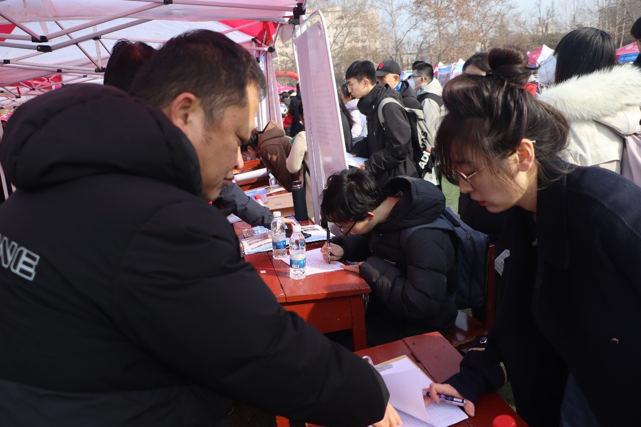 党委书记田云飞、院长王茂励、党委副书记范瑞红以及全体辅导员前往现场走访用人单位,了解当前企业需求和学生的应聘情况。