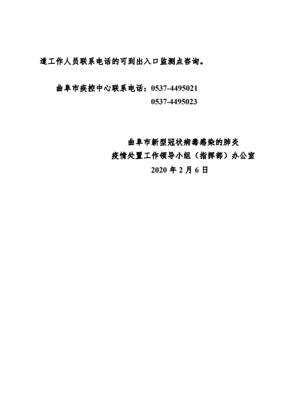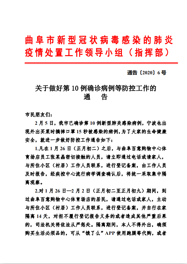 曲阜市关于做好第10例确诊病例等防控工作的通告