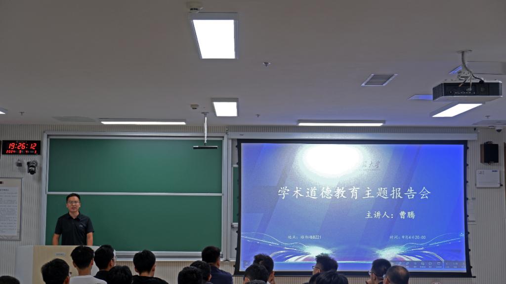 随后,曹腾继续深入探讨了本次班会的另一个重要主题——学术道德与学术规范。他强调在学术研究中保持诚信和遵守规则是每位学生必须坚守的底线。学术不端行为不仅会摧毁个人的学术声誉,更会对学术环境造成不可挽回的损害,提醒同学们要时刻保持严谨的学术态度。最后曹腾鼓励大家在科研过程中勇于探索,追求学术上的真实和原创,不急功近利,不抄袭他人成果,要在实践中不断磨炼自己的研究能力,为未来的发展打下扎实的学术基础。